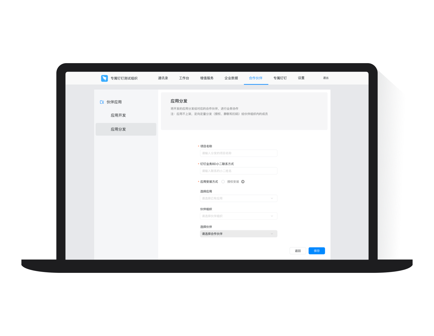 支持主企业开发应用快速分发给合作企业, 无需审批,只需操作一步, 就可完成和伙伴的业务协同。
