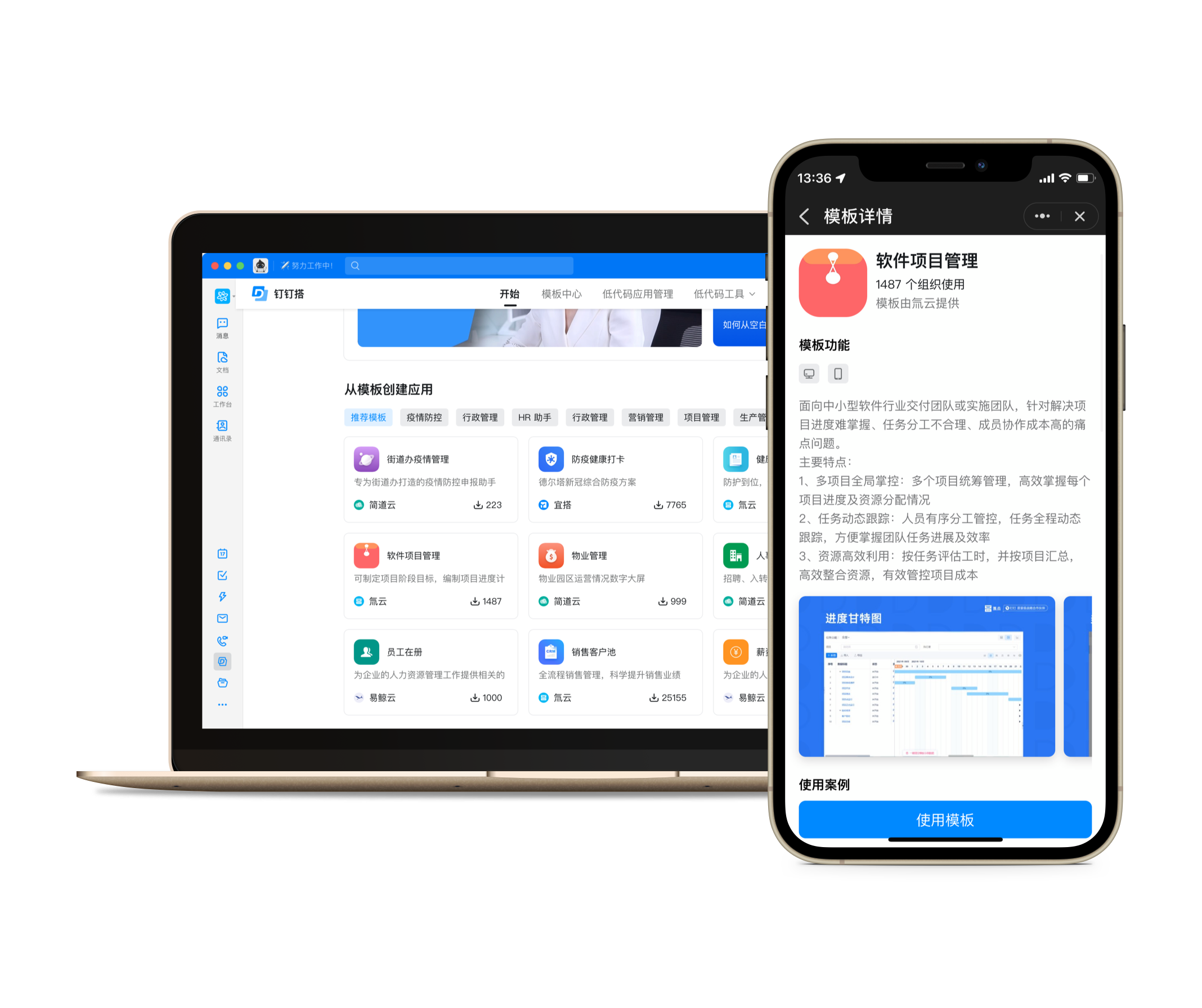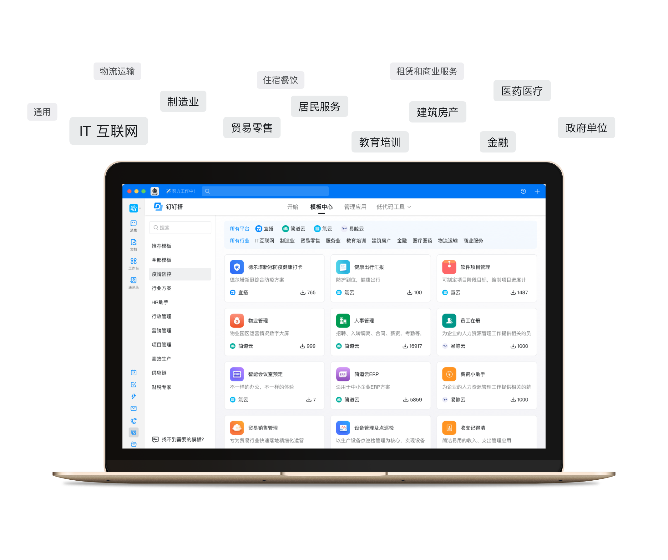 宜搭、氚云、简道云、易鲸云等头部低代码厂商入驻,支持用拖拉拽的方式,像搭积木一样搭建应用,简单快捷。