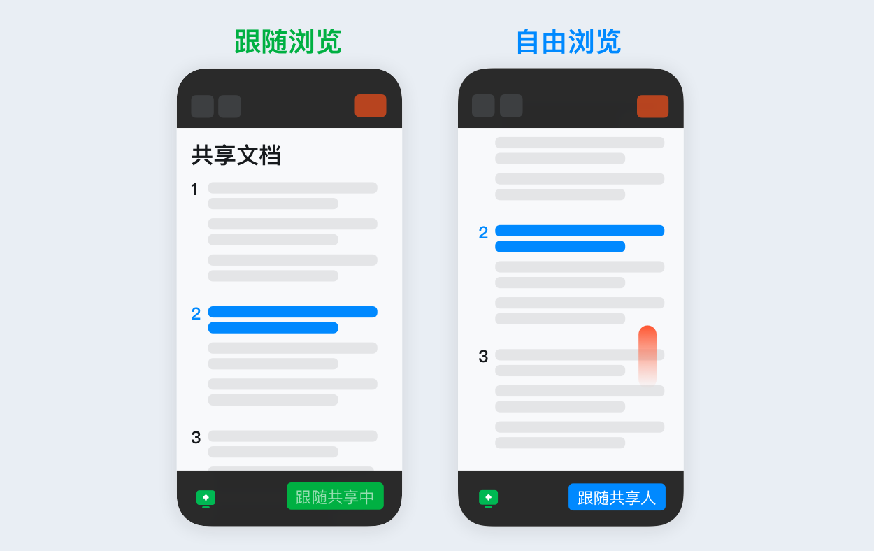 会中共享文档,参会人可选择跟随主持人,也可以选择自由浏览