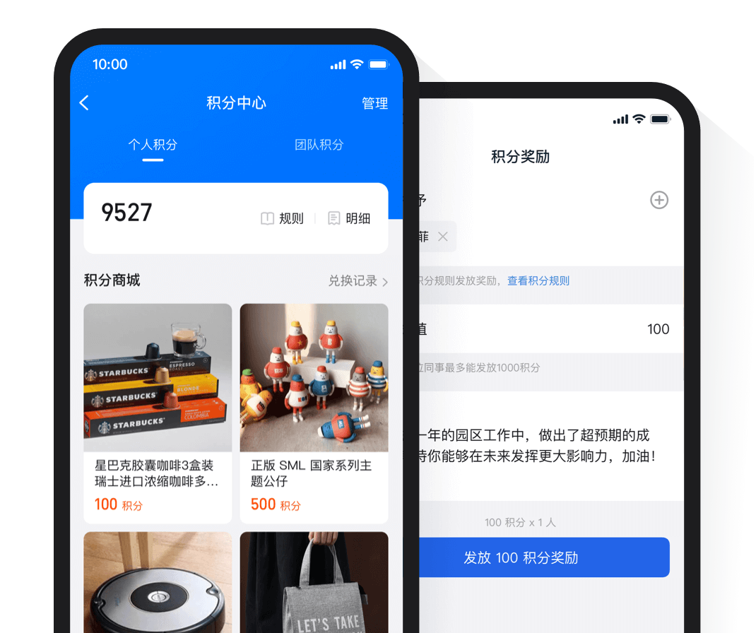 团队荣誉积分可作为团队荣誉奖励,及时发放给团队/员工。还可设置实体商品兑换,提升奖励效果。