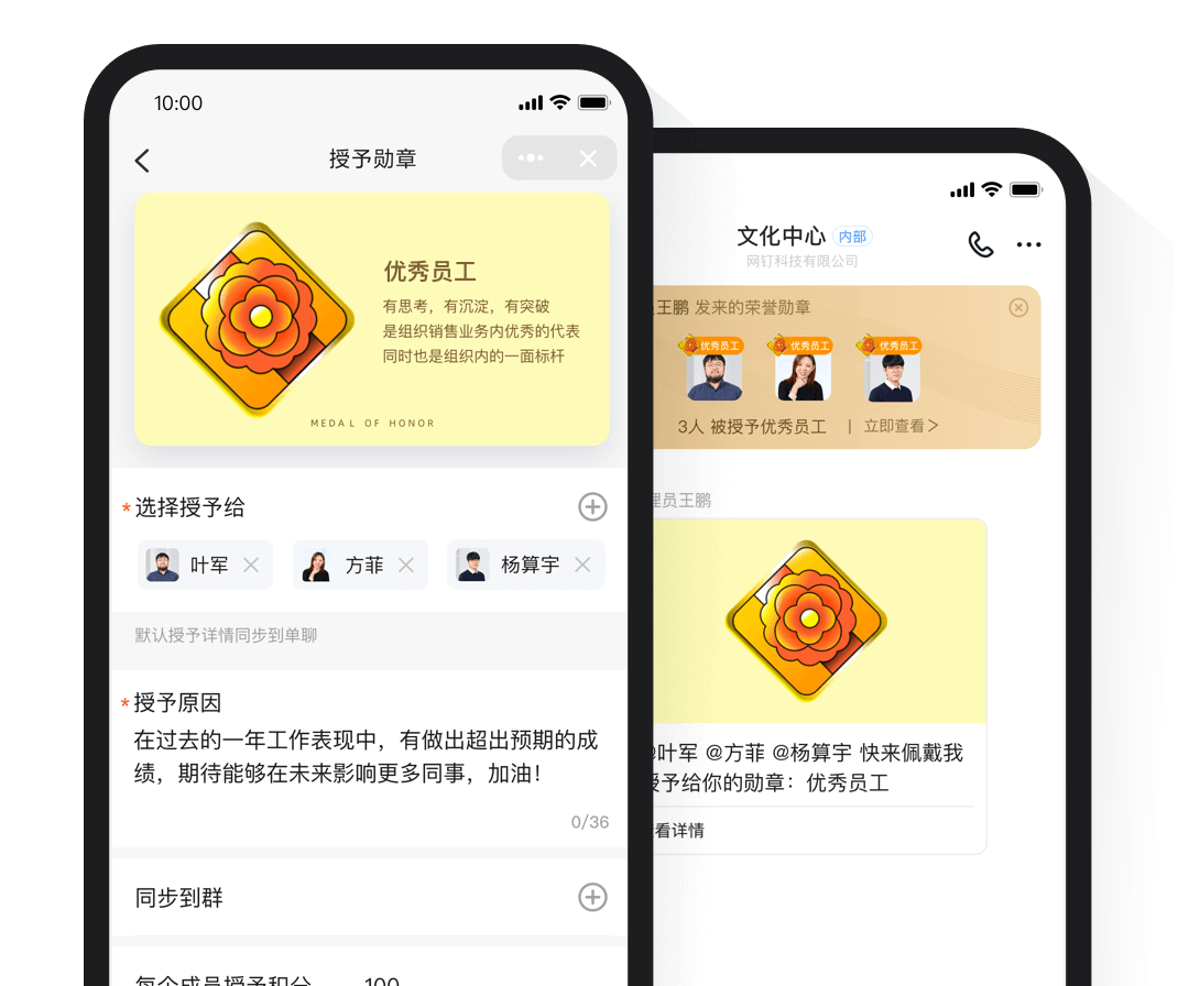 员工成长"入职一周年 团队杰出贡献"都可设置专属荣誉勋章发放给员工,见证员工在组织内的成长。